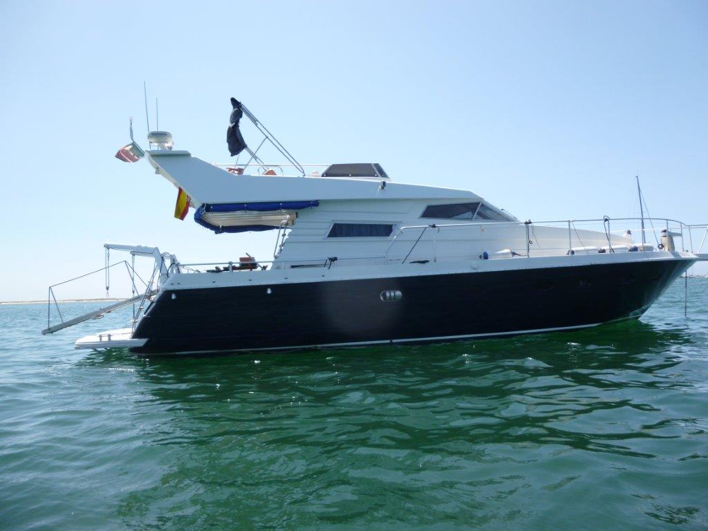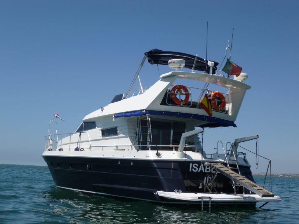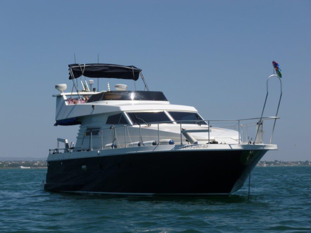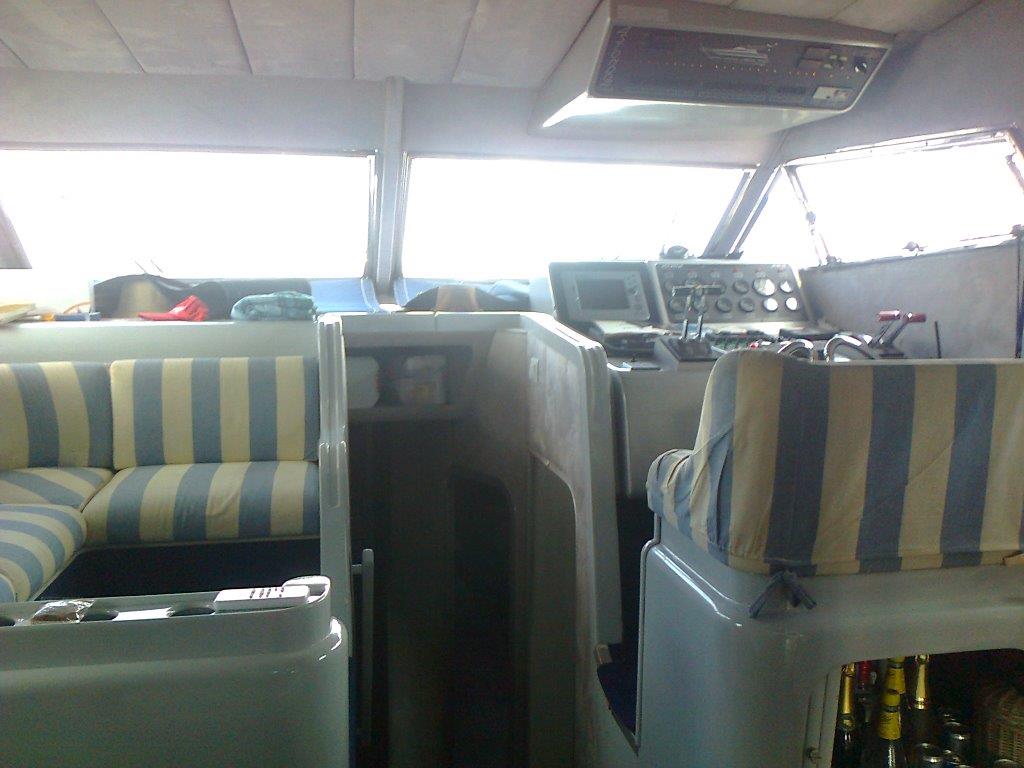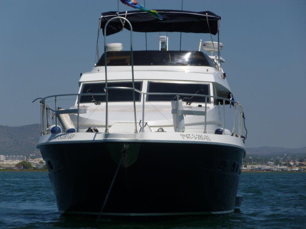 Lotação: 10 pessoas | Comprimento: 15 m | Boca: 4,20m | 2 motores turbo diesel 500 + 500 cv; 2 postos de comando | GPS, radar, sonda, VHF, Piloto automático